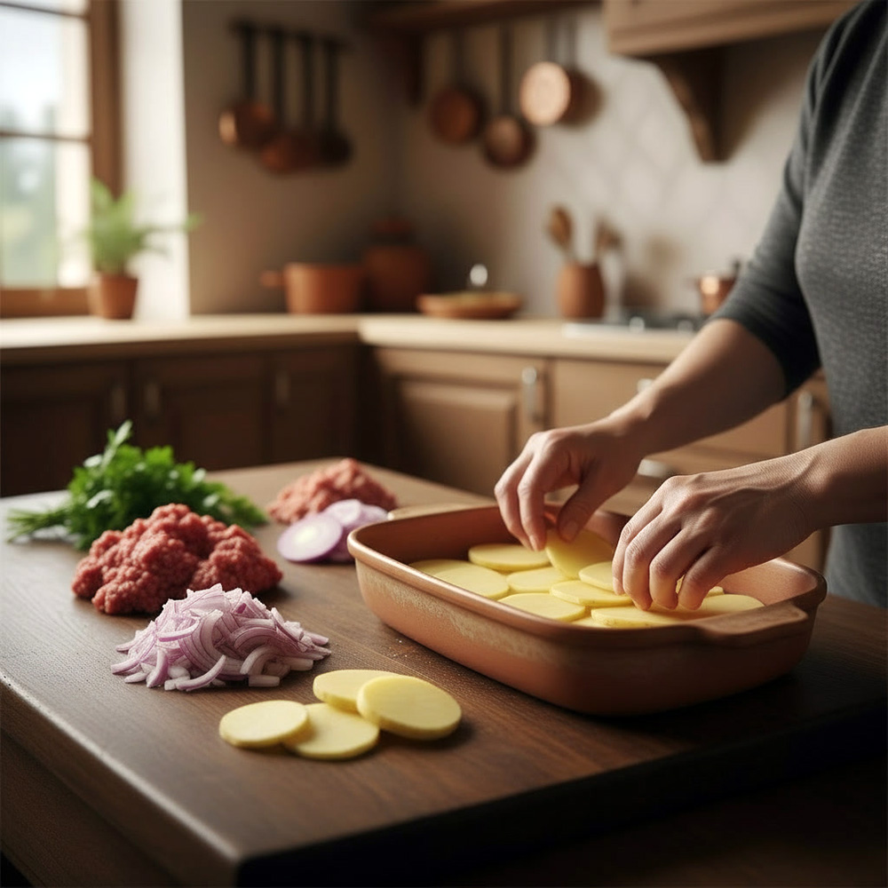- 200 ml Wasser oder Brühe über die Schichten gießen, damit die Kartoffeln gut garen können.