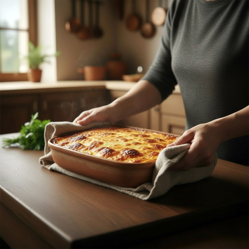 - Die Musaka aus dem Ofen nehmen und vor dem Servieren etwa 10 Minuten ruhen lassen.