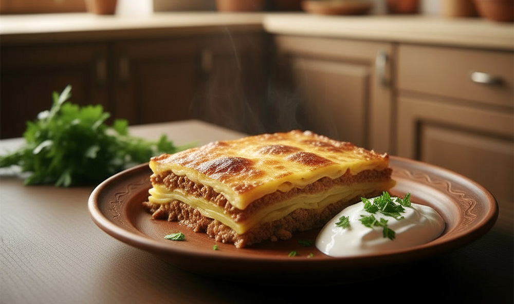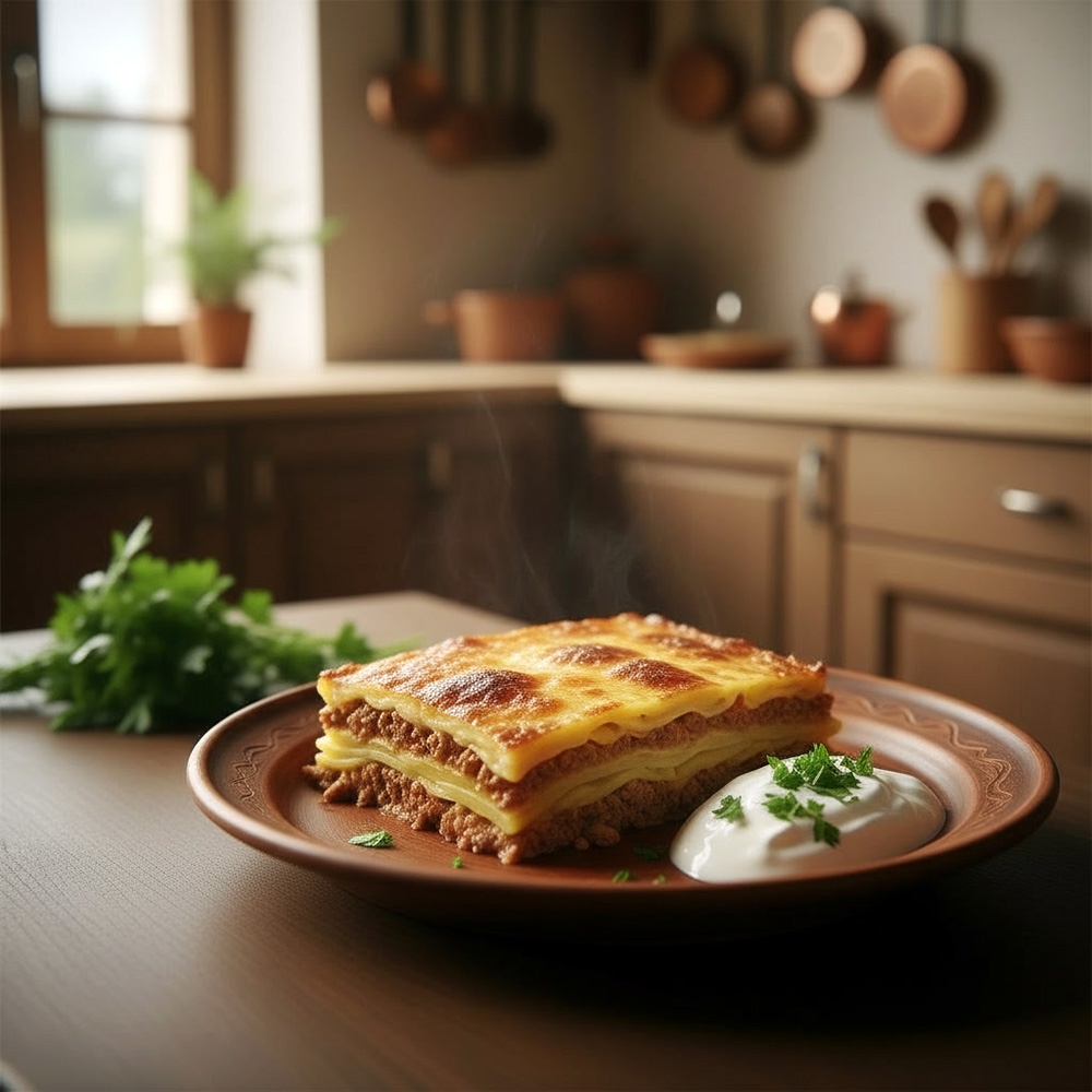 Bulgarische Musaka ist ein traditionelles Ofengericht aus Kartoffeln, Hackfleisch (meist Rind oder Schwein), Zwiebeln und Gewürzen. Im Gegensatz zur griechischen Version enthält sie keine Auberginen, sondern wird mit gewürfelten Kartoffeln zubereitet. Die Zutaten werden geschichtet und mit einer Mischung aus Eiern und Joghurt überbacken, die eine goldene Kruste bildet. Sie ist ein beliebtes Hausmannsgericht in Bulgarien und wird oft mit Joghurt serviert. Musaka ist herzhaft, sättigend und ein fester Bestandteil der bulgarischen Küche.