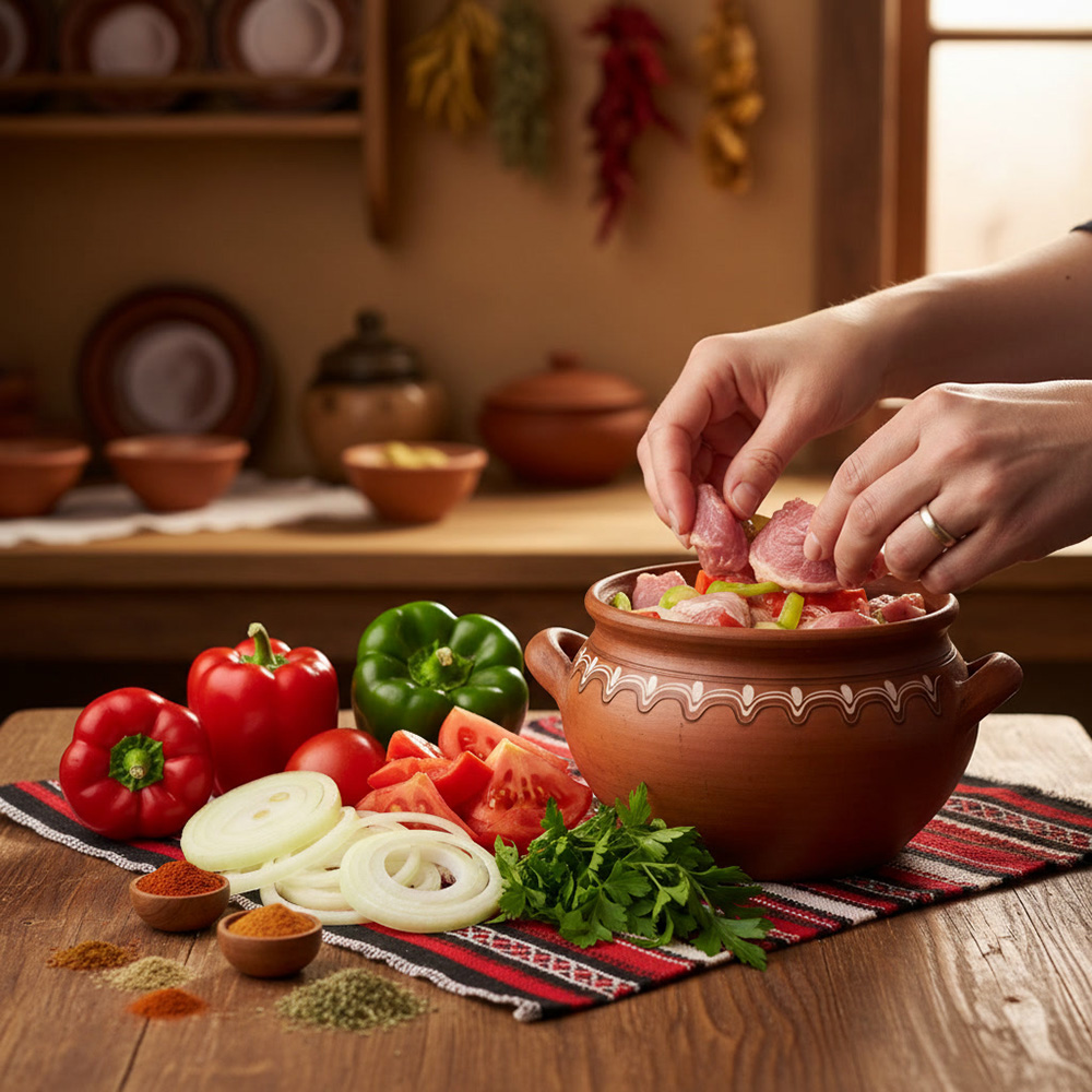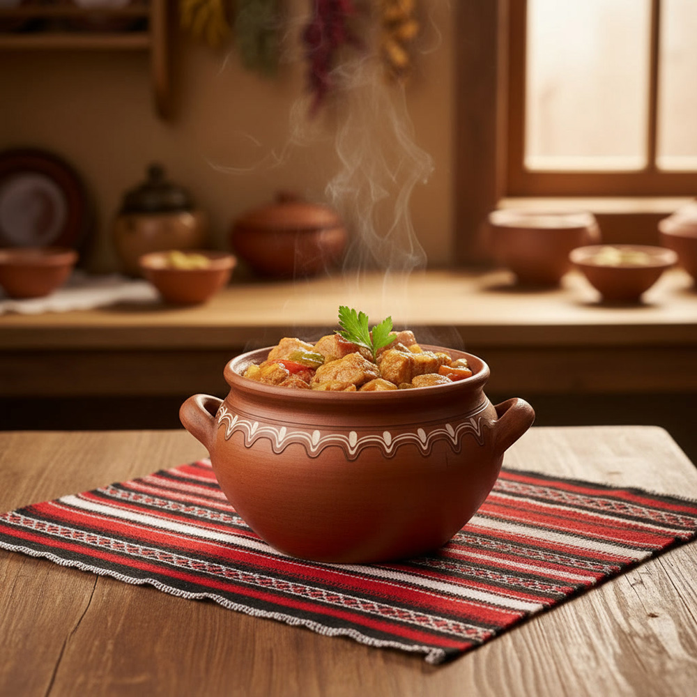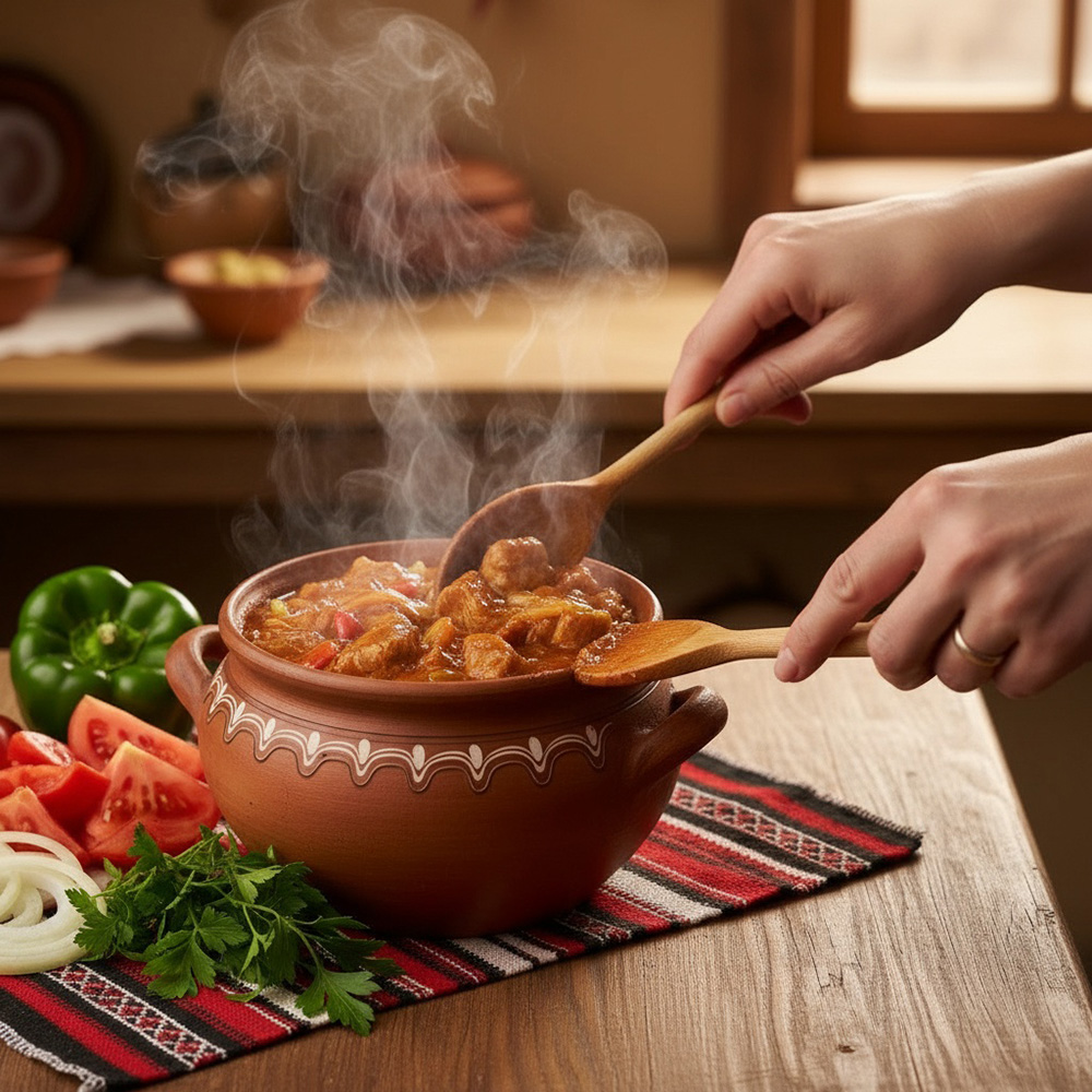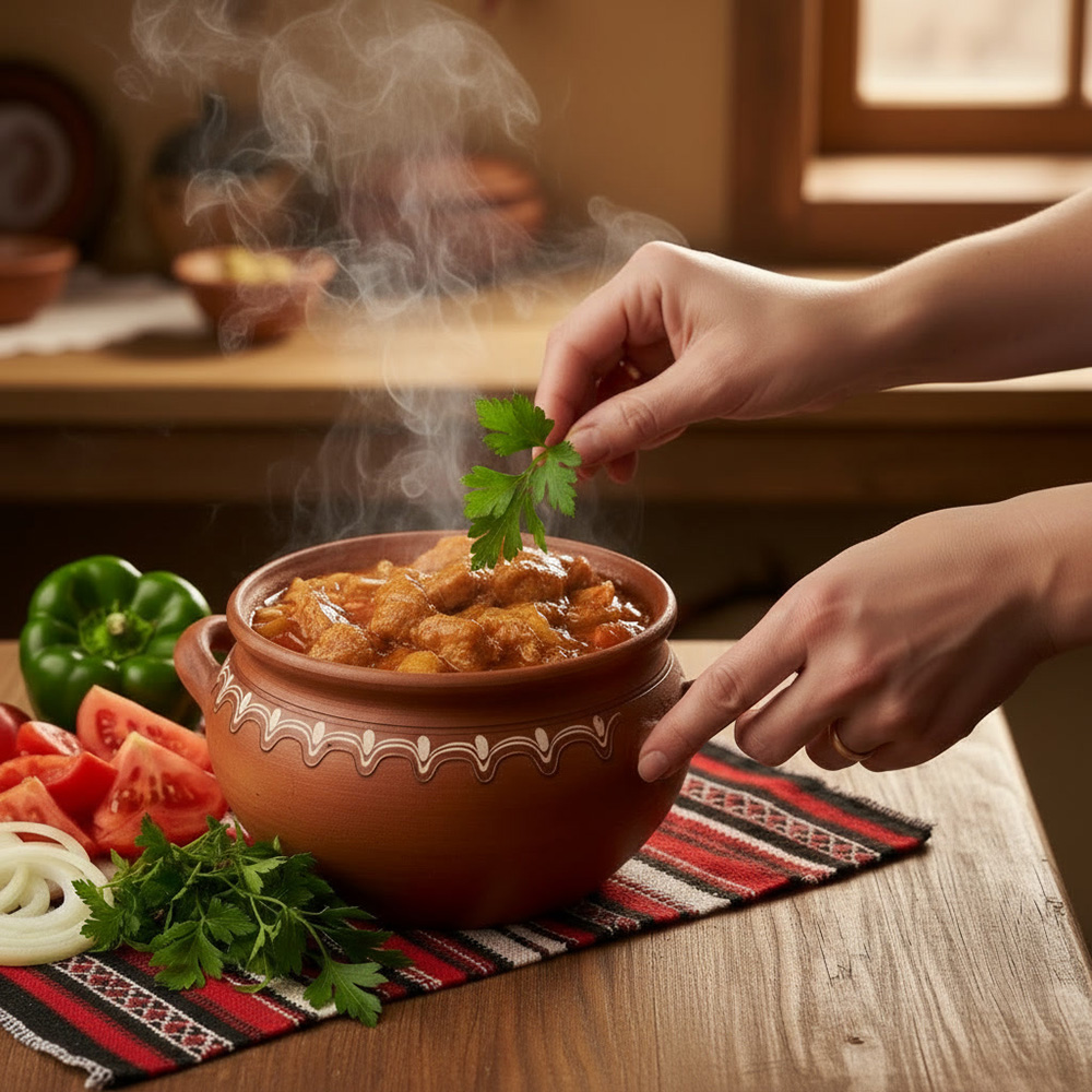 Kavarma ist ein herzhaftes bulgarisches Schmorgericht, das typischerweise mit Schweinefleisch, Zwiebeln, Paprika und Tomaten zubereitet wird. Das Gericht wird langsam geschmort, sodass sich die Aromen perfekt entfalten. Es wird traditionell in einem Tschomlek (Ton- oder Keramiktopf) serviert.