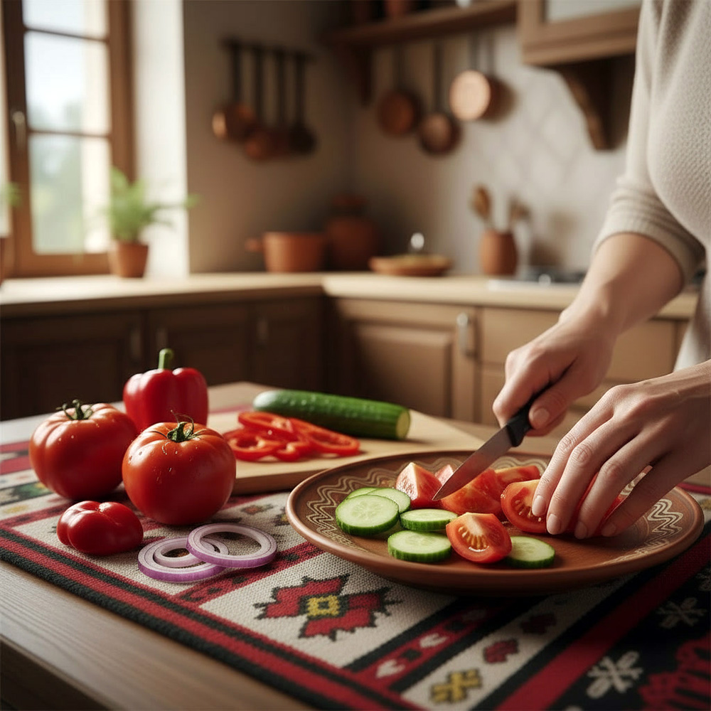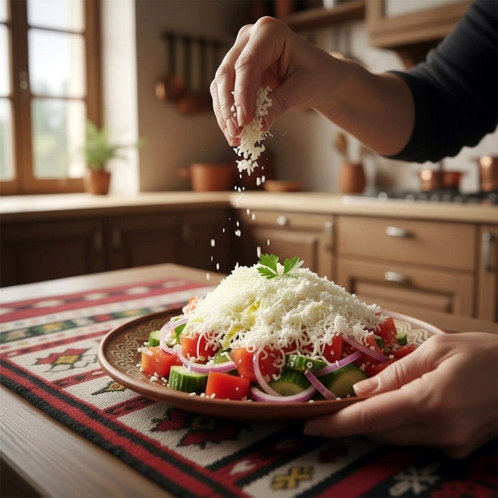 Der Shopska Salat wird oft mit frischem Brot und einem Glas Rakija (bulgarischer Obstbrand) serviert. Er passt perfekt zu gegrilltem Fleisch wie Kebapche oder Kavarma.